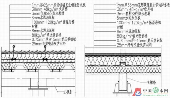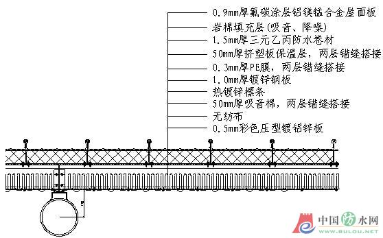 該屋面構造由下至上的順序為:壓型鋼底板、吸音層、隔汽層、保溫層、隔聲層、“特衛強”膜材防水層、抗噪層和鋁鎂錳合金板材裝 飾兼防排水構造層。屋面的防排水施工要點如下:
