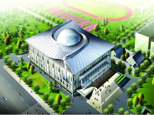 2)北京工業大學體育館總建筑面積2.44萬㎡,觀眾座席7500個,呈扁平的羽毛球狀,圓形屋面的直徑104m,由鋁鎂錳合金板和玻璃飄棚組成。