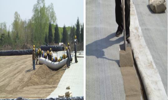 3.1.6奧林匹克森林公園的人工濕地、人工湖以及“龍形水系”均采用鈉基膨潤土防水毯作防滲層�?偡罎B層的面積約100萬㎡,其構造 層次及鋪設方法(見圖3.1.6-1、圖3.1.6-2)。