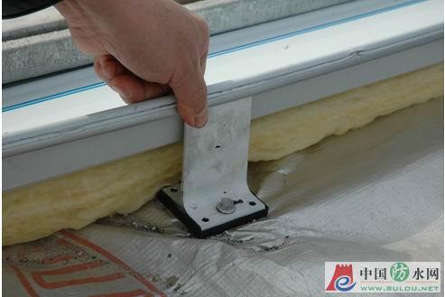(2)在完成防水膜的鋪設后,按規定位置彈出基準線,并在需要安裝T碼固定支座的防水膜上部墊上一層與支座底部大小相等厚度1.5㎜的雙面粘丁 基密封膠帶,然后用螺釘將T碼固定支架固定在防水膜下面的鋼檁條上(見圖3.1.1-8)。